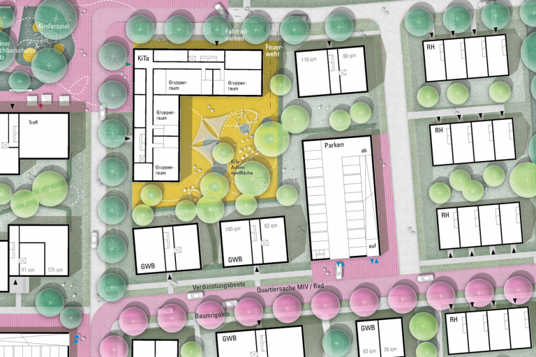Die bauliche Gestalt des Quartiers wird durch eine Struktur differenziert gestalteter Grünräume gegliedert, welche die einzelnen Siedlungsflächen miteinander vernetzen und das neue Quartier in das übergeordnete Freiraum- und Landschaftsgefüge einbinden. Formelle wie informelle Wegebeziehungen des Bestands werden aufgegriffen und in die Grünkorridore eingeflochten. So entsteht ein eng verknüpftes Netz kurzer Wege für Fußgänger und Radfahrer. Baumneupflanzungen mit Baumsolitären gliedern das naturnah gestaltete Parkband. Die zur Vernetzung angegliederten grünen Fugen sind entsprechend ihrer Lage und Ausrichtung unterschiedlich belegt und integrieren Retentions- und Spielflächen. Unterschiedlich gestaltete Plätze bieten sowohl Bewegungs- und Spielmöglichkeiten als auch ruhige Bereiche zum Verweilen. Als Freiraumelemente werden hier Tischtennisplatten, Pergolen, zahlreiche Bänke, Hocker, Bücherregale, Trinkbrunnen usw. angeboten. Die Innenhöfe werden individuell gestaltet und bieten vielfältige Möglichkeiten zum Spielen und Verweilen mit viel Schatten.
