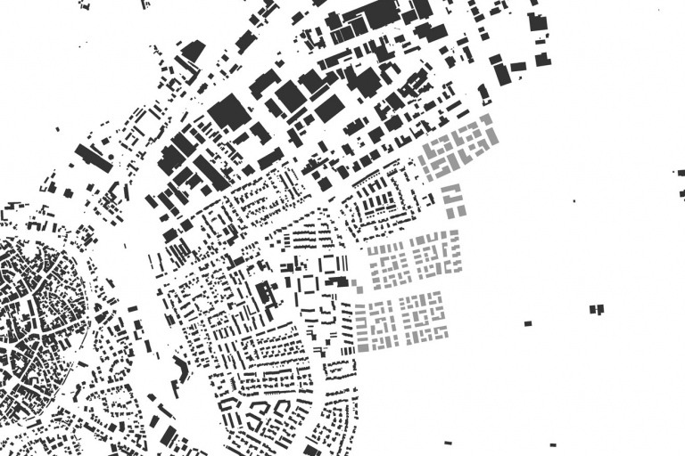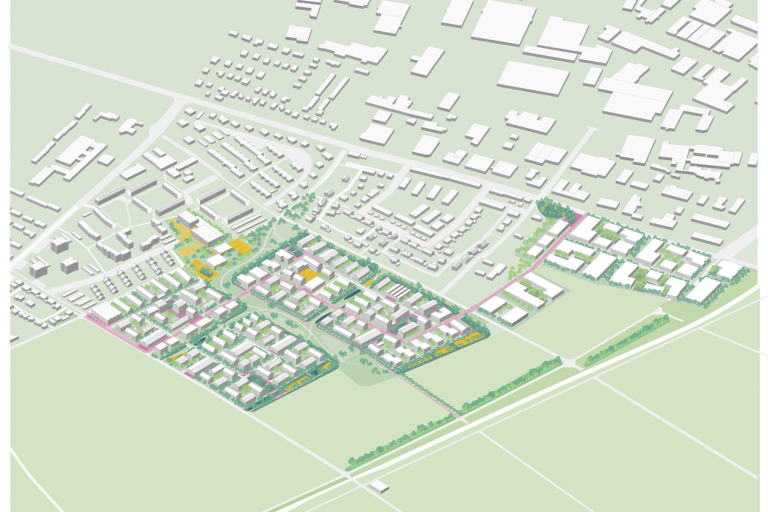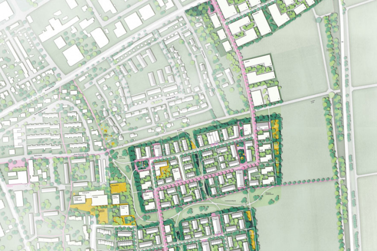 Die typologische Diversität erzeugt hinsichtlich der Geschossigkeit ein Spektrum von II – V, wobei sich die fünfgeschossige Bebauung auf einzelne Punkte an Plätzen beschränkt. Jeder der beiden vorgeschlagenen Wohnbaufinger verfügt entsprechend seiner Dualität von zwei Baufeldern über einen inneren und einen nach außen gerichteten Nachbarschaftsplatz. Die inneren Plätze fungieren als Knotenpunkte des Alltags und werden in ihrer räumlich-urbanen Disposition durch aktivierte Erdgeschosszonen mit gewerblichen oder gemeinwohlorientierten Nutzungen unterstützt. Die nach außen gerichteten Plätze öffnen sich zu den übergeordneten Freiräumen und man erlebt die Urbanität des Platzes kombiniert mit der Weite des landschaftlichen Zusammenhangs als Treffpunkt am Abend oder am Wochenende. Das neue Quartier zeichnet sich insgesamt durch eine wohldosierte Urbanität aus, welche die Komponenten Landschaftsbezug, Gemeinschaft, typologische Vielfalt, Adressbildung und Vernetzung miteinander verknüpft und hieraus eine unverwechselbare Identität entwickelt.