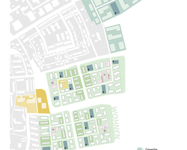 Grünkorridore das Freiraumgerüst. Sie teilen das neue Quartier in überschaubare Einheiten und sorgen