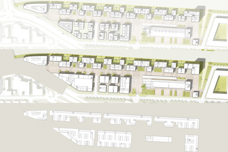 Östlich des zukünftigen Bahnhaltepunktes ist das Wettbewerbsgrundstück in seiner ganzen Tiefe bebaubar, sodass eine Blockstruktur vorgeschlagen wird. Vorteilhaft ist hierbei ein hohes Maß an Robustheit im Sinne von Nutzungsoffenheit. So beherbergen die ersten beiden Blöcke von der Güterhalle her Wohnen und der Dritte Büros im Bereich des eingeschränkten Gewerbegebietes.