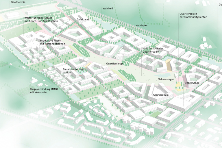 die digitale Haustechnik beinhaltet. Hierzu werden möglichst viele Neubauten des Stadtquartiers in Hybrid- oder Holzbauweise realisiert oder ausgestaltet, sodass in Zukunft flexibel auf mögliche Nutzungsänderungen baulich reagiert werden kann. Die vorgeschlagene Bebauung besteht aus kompakten Gebäudetypen, die mit kleinem Oberflächen-/Volumenverhältnis niedrige Baukosten und geringe Energieverbräuche erwarten lassen.