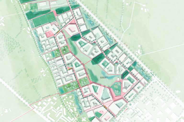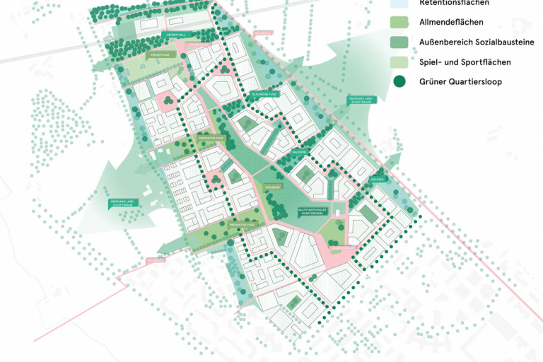 Die bauliche Gestalt des Quartiers wird durch eine Struktur differenziert gestaltete Grünräume gegliedert, welche die einzelnen Siedlungsflächen miteinander vernetzen und das neue Quartier in das übergeordnete Freiraum- und Landschaftsgefüge einbinden. Formelle wie informelle Wegebeziehungen des Bestands werden aufgegriffen und in die Grünkorridore eingeflochten. So entsteht ein eng verknüpftes Netz kurzer Wege für Fußgänger und Radfahrer. Zentrale Bedeutung kommt dem Quartiersplatz mit dem sich daraus entwickelnden Park als neuer Mitte für den gesamten Stadtteil zu. Auf der West- und Ostseite wird der Park von Fuß- und Radwegen begleitet, wobei es sich auf der Westseite um eine breite Promenade handelt, der parkseitig Spiel- und Bewegungsangebote zugeordnet wurden. Baumneupflanzungen mit Baumsolitären gliedern den naturnah gestalteten Park und betonen die Nord-Süd-Beziehung. Die zur Vernetzung angegliederten grünen Fugen sind entsprechend ihrer Ausrichtung unterschiedlich belegt. Im Westen wurden die bestehenden Obstbäume am Wasserweg aufgegriffen und zu einer produktiven Gartenlandschaft im Sinne der essbaren Stadt weiterentwickelt. Entlang des Wasserwegs wird das Wasser zurückgehalten und als namensgebendes Element thematisiert. Die Einbindung des Regenwassers findet aufgrund der Topografie ebenso auf der Ostseite statt. Hier ist es aber in eine wildere Struktur eingebettet - als Offenland mit Baumgruppen entlang der Steinfurter Straße