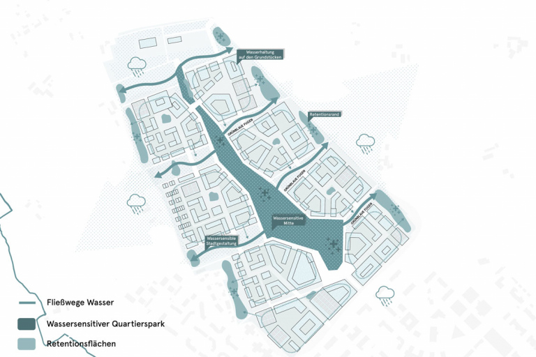 Die topografische Gestaltung der Quartiere führt das anfallende Regenwasser über offene Rinnen in die grünen Fugen und von dort nach außen in die großzügigen Retentionsräume, wo es dezentral zurückgehalten, verdunstet und aufgrund der Bodenverhältnisse nur in geringem Maß versickert werden kann. Bei Starkregenereignissen dienen weitere Flächen in den Grünräumen als Retentionsvolumen, sodass eine Einleitung in den Kinderbach verzögert erfolgen kann. Durch die unzureichende Versickerungsfähigkeit des Bodens setzt das Retentionskonzept frühzeitig an und fängt das Regenwasser der Dachflächen über Dachbegrünung und Zisternen bestmöglich ab.