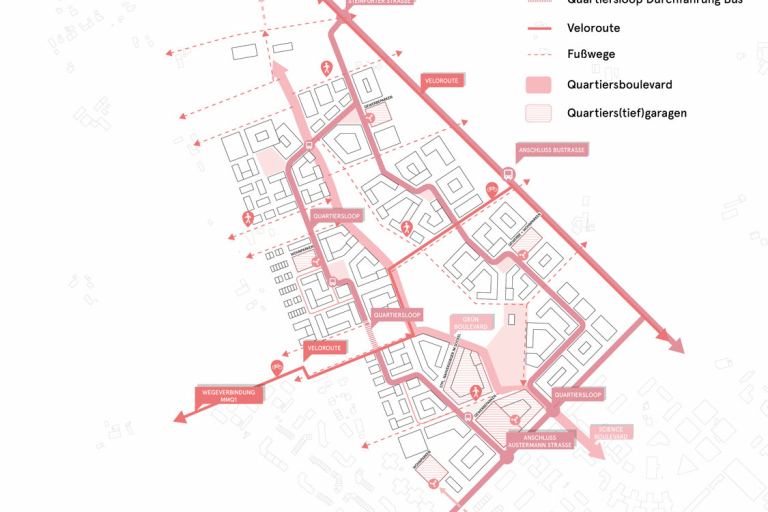 Der Entwurf schlägt neben der nördlichen Anbindung von der Steinfurter Straße zwei Zufahrten von der Austermannstraße ins Quartier vor, wobei die westliche Anbindung nur den südlichen Bereich erschließt und die Durchfahrt nach Norden lediglich dem Busverkehr gestattet ist. Die innere Busverbindung durchquert die westlichen Teilbereiche des Quartiers von der Austermannstraße auf der Höhe der Wilhelm-Schickard-Straße bis zum Knotenpunkt Steinfurter Straße / Wilkinghege. Dazwischen werden Haltepunkte auf der Höhe der Grundschule mit Anbindung an den zentralen Platz, am Nachbarschaftplatz des mittleren westlichen Clusters sowie in der grünen Fuge zwischen den beiden nördliche Clustern unmittelbar neben der weiterführenden Schule vorgeschlagen. Der östliche Teil des neuen Quartiers profitiert von der bestehenden Haltestelle Kortenbrede an der Steinfurter Straße. Neben der Busanbindung setzt das Verkehrskonzept auf privilegierte Car-Sharing-Parkplätze mit Ladestationen und Abstellflächen für Lastenräder und E-Bikes in 5 Mobility Hubs. Der ruhende Verkehr verteilt sich auf die in den Mobility Hubs integrierten Quartiersgaragen, welche alle privaten Stellplätze und einen Teil der öffentlichen Stellplätze aufnehmen. Es werden im Außenraum lediglich öffentliche Kurzzeitparkplätze eingerichtet, welche vor allem Pflege- und Liefer-Diensten dienen. Für Fußgänger und Radfahrer wird ein dichtes Nahmobilitätsnetz mit optimalen Anschlüssen an die Bestandsgebiete und die Landschaftsräume angeboten.