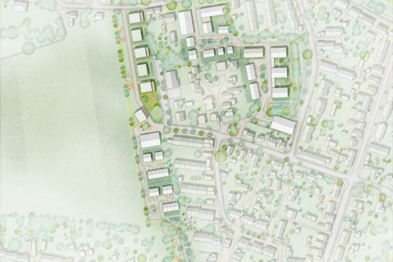 Ortsrand nach dem Prinzip der Offenheit. Eine einseitige Bebauung mit Punkthäusern unterstützt die